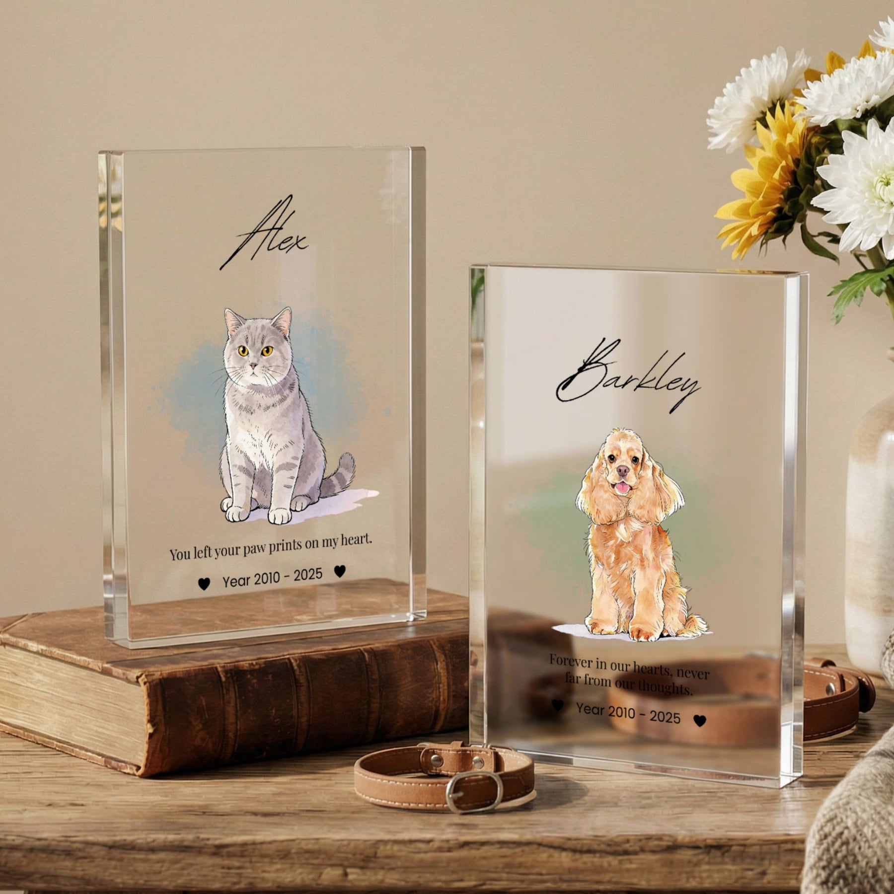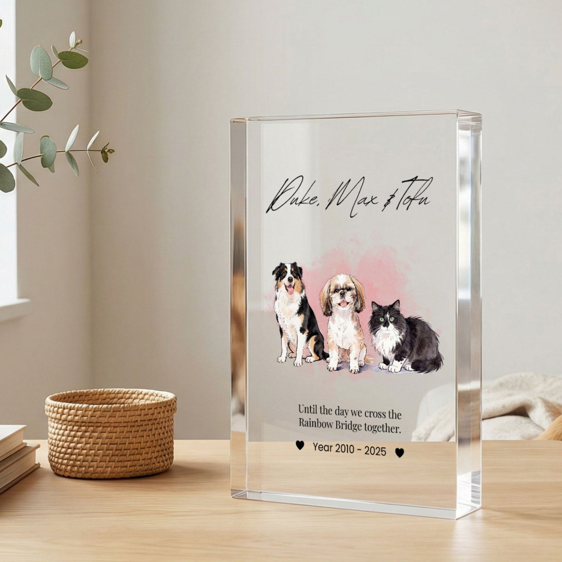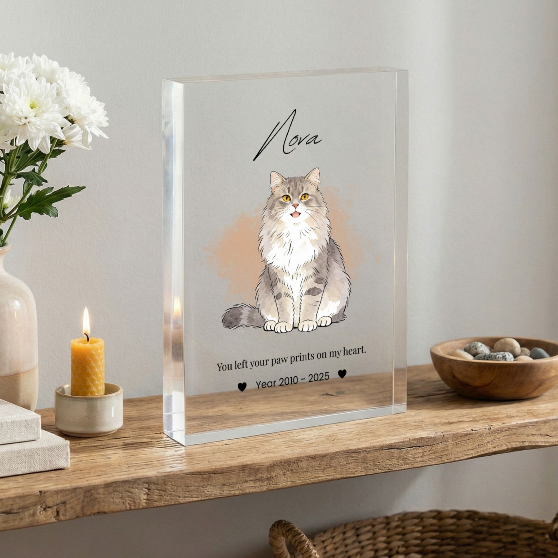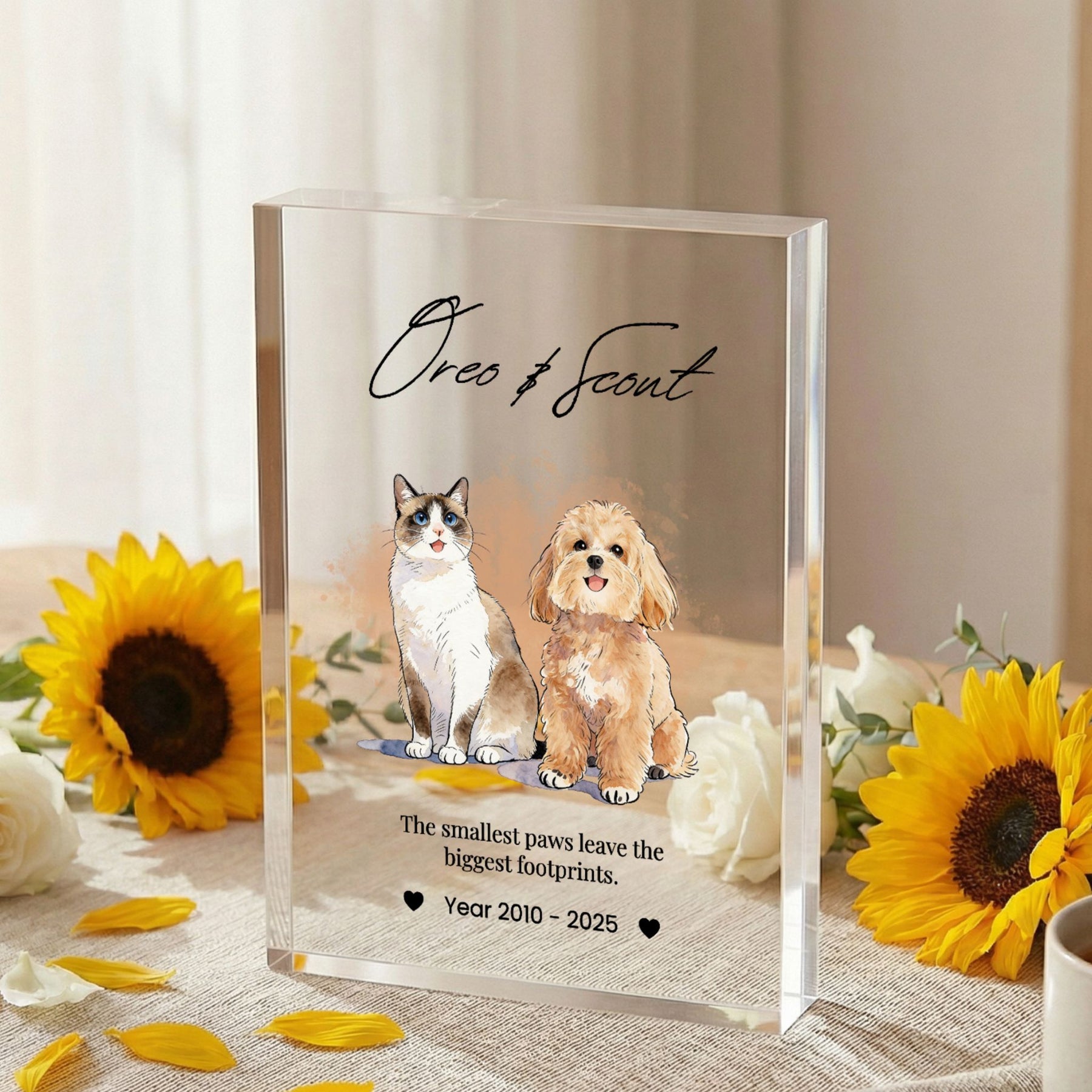 Honor the memory of your beloved companion with this modern and elegant custom acrylic photo block. Unlike traditional frames, this crystal-clear block provides a stunning 3D effect, giving your pet’s portrait a depth and clarity that beautifully captures their spirit. Its sleek, glass-like finish fits perfectly into any contemporary home or office, serving as a timeless and heartfelt tribute to the bond you shared.