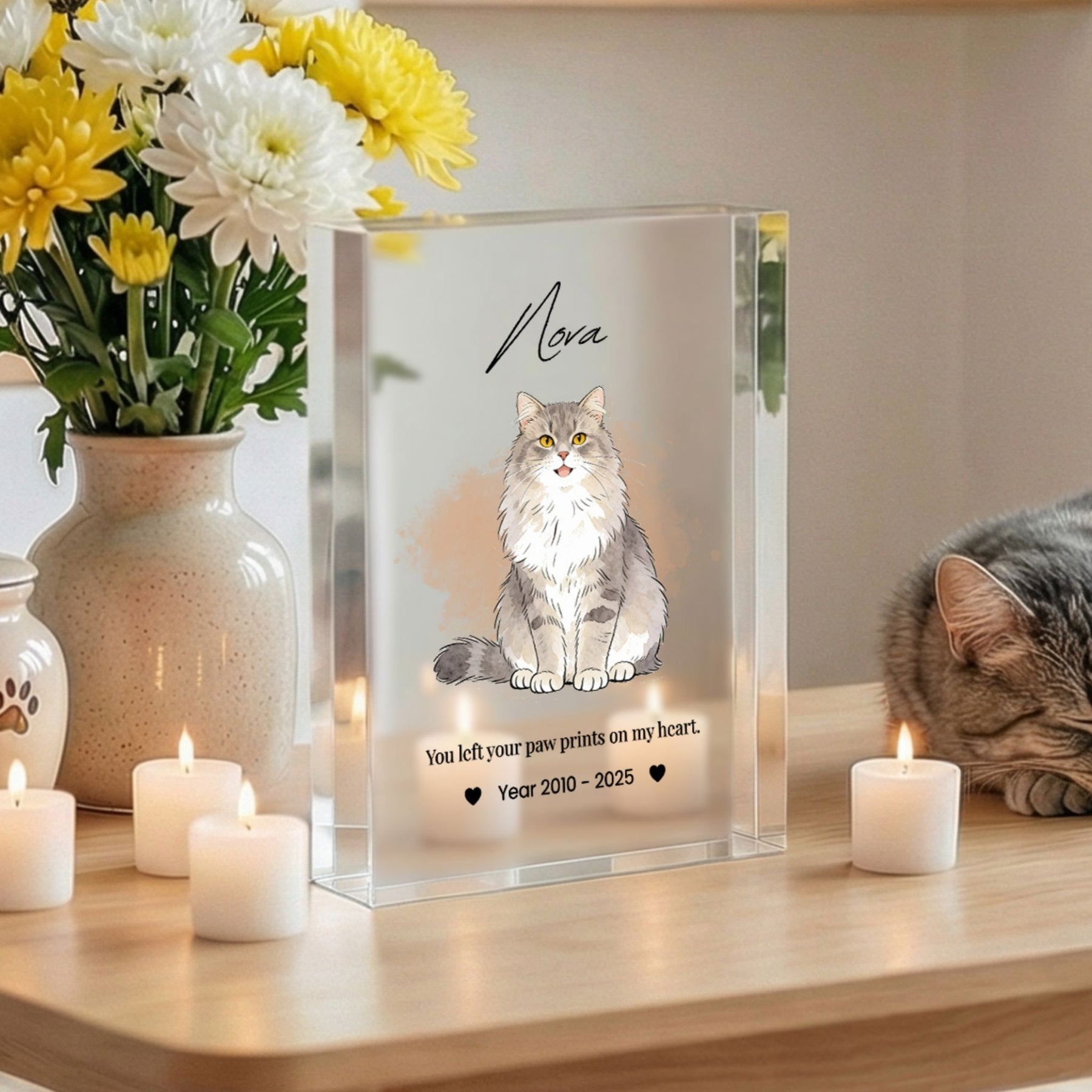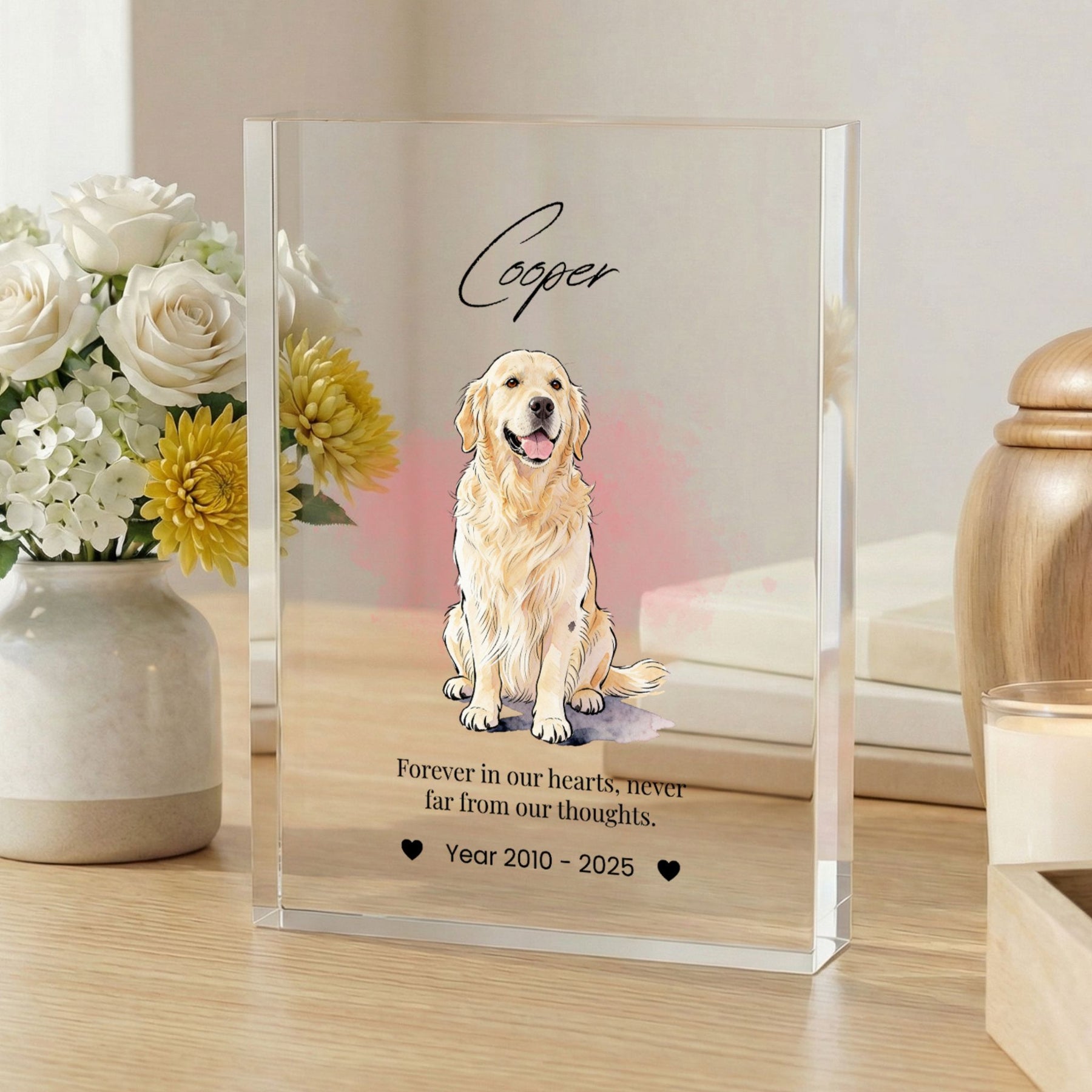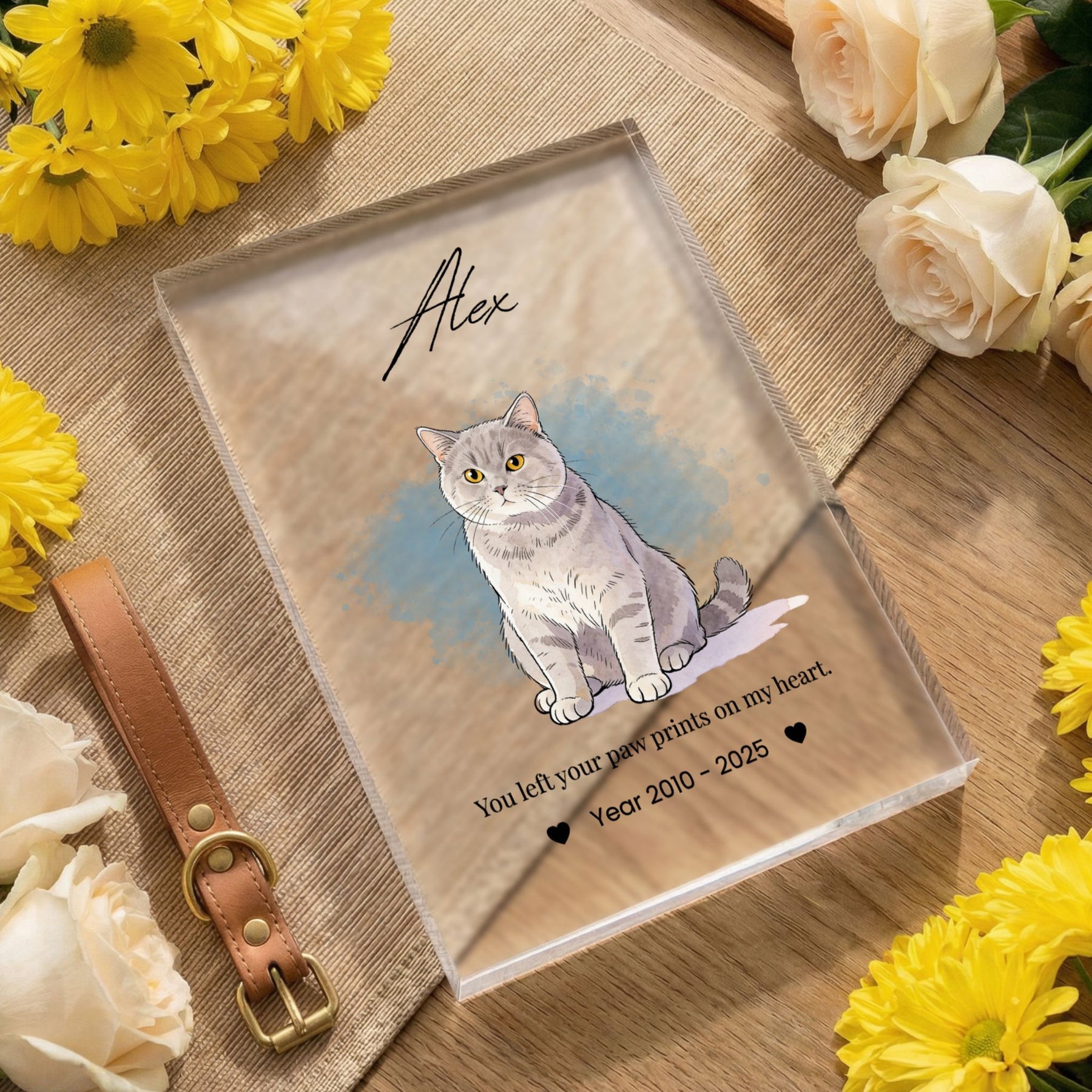 Honor the memory of your beloved companion with this modern and elegant custom acrylic photo block. Unlike traditional frames, this crystal-clear block provides a stunning 3D effect, giving your pet’s portrait a depth and clarity that beautifully captures their spirit. Its sleek, glass-like finish fits perfectly into any contemporary home or office, serving as a timeless and heartfelt tribute to the bond you shared.
