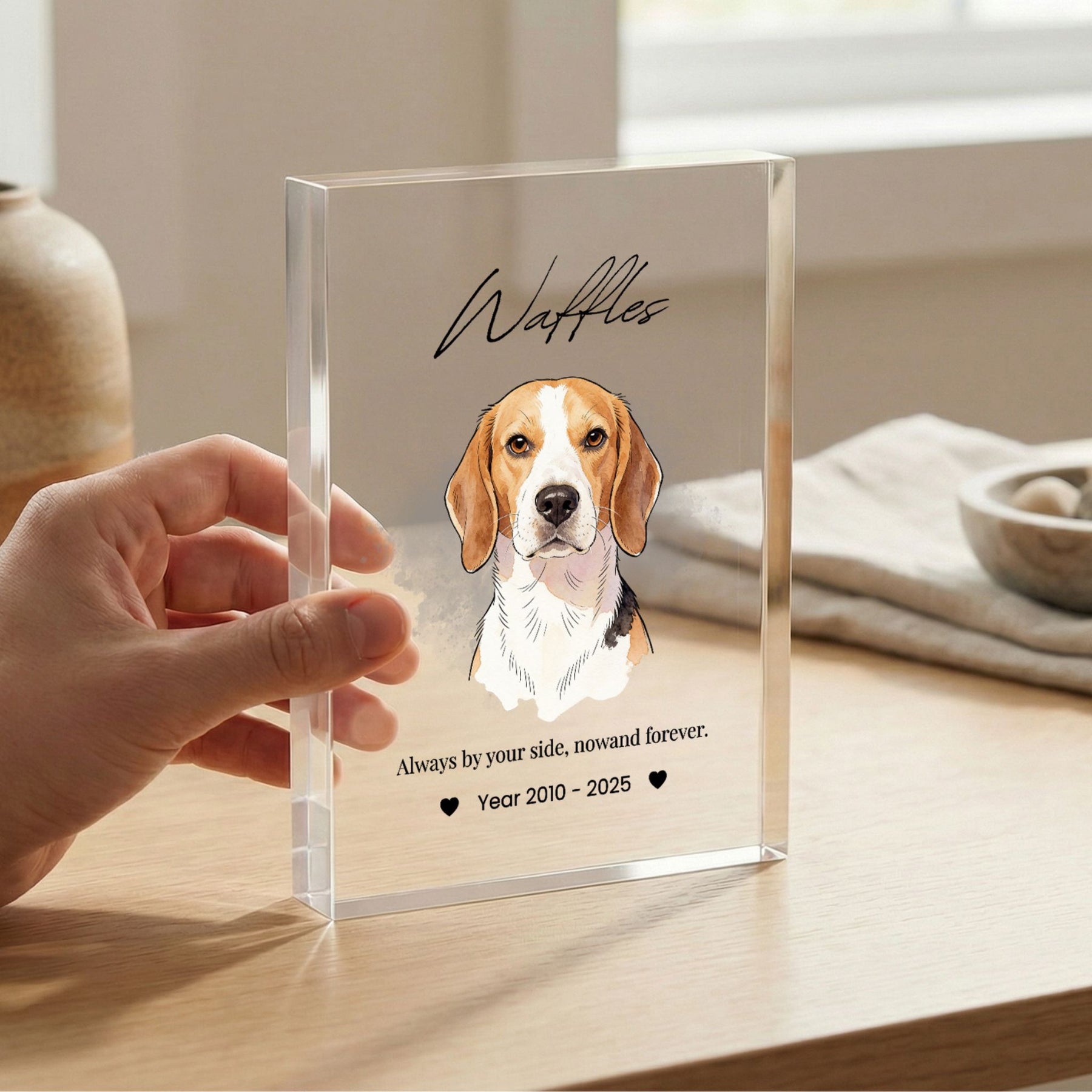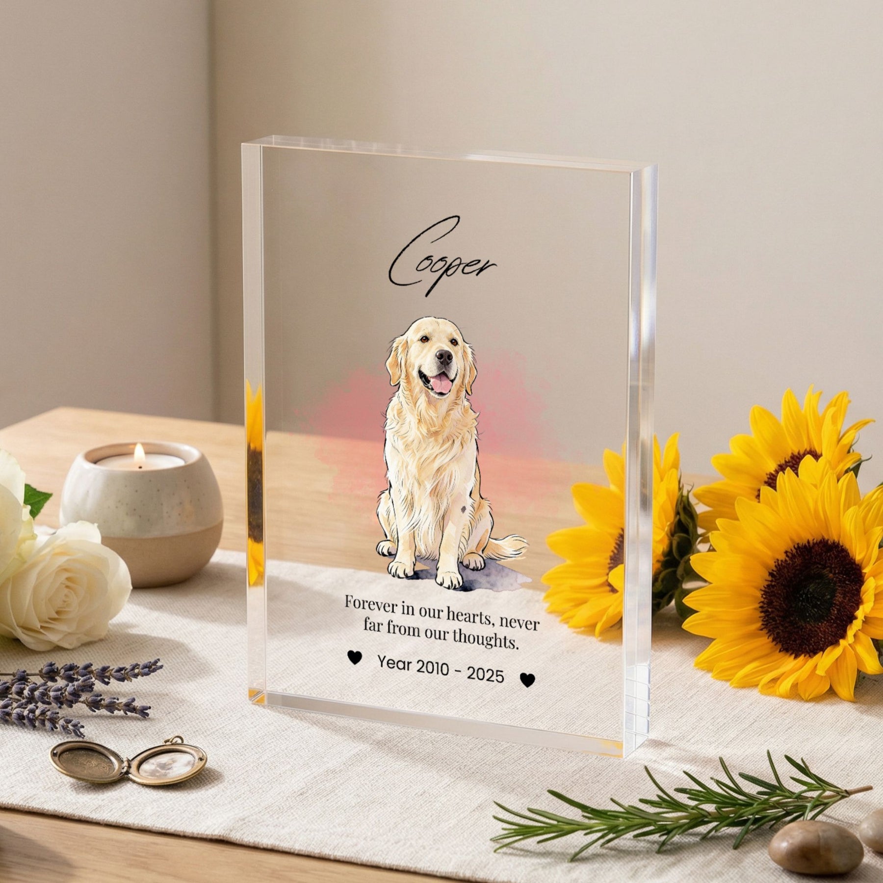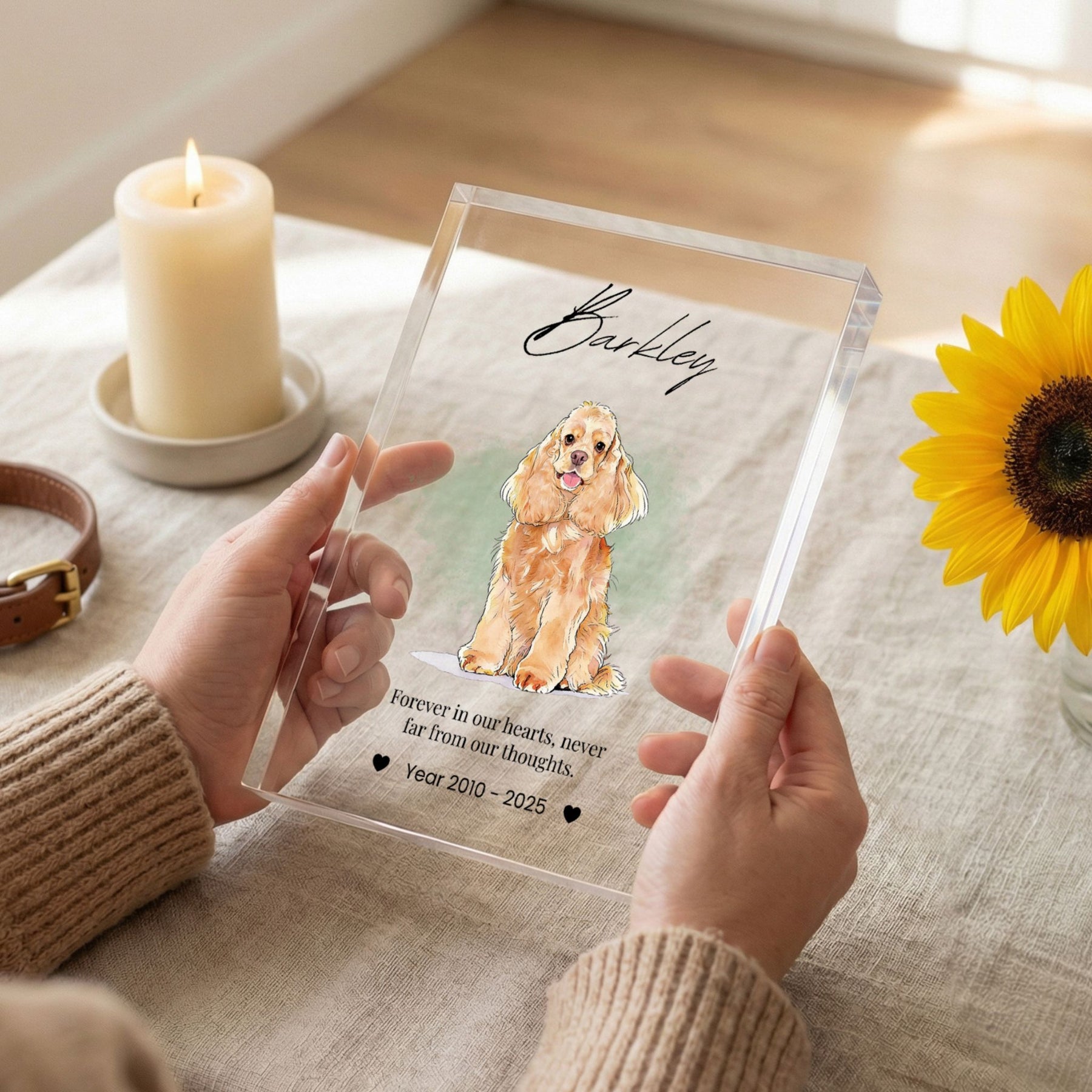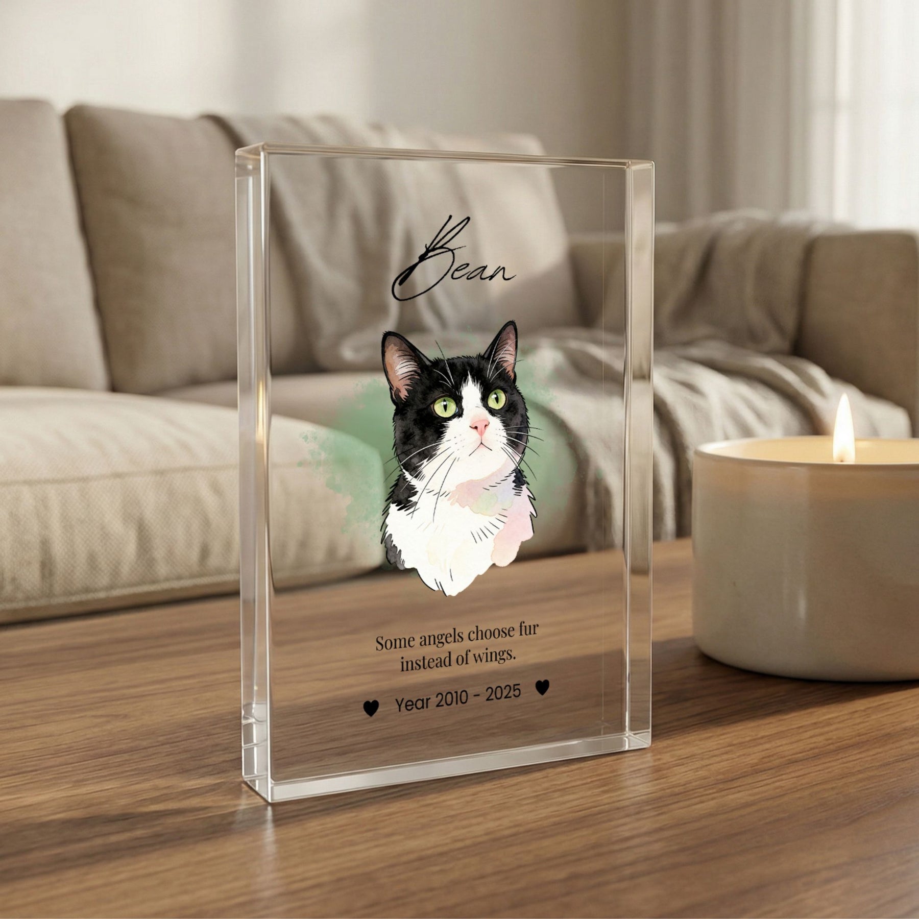 Honor the memory of your beloved companion with this modern and elegant custom acrylic photo block. Unlike traditional frames, this crystal-clear block provides a stunning 3D effect, giving your pet’s portrait a depth and clarity that beautifully captures their spirit. Its sleek, glass-like finish fits perfectly into any contemporary home or office, serving as a timeless and heartfelt tribute to the bond you shared.