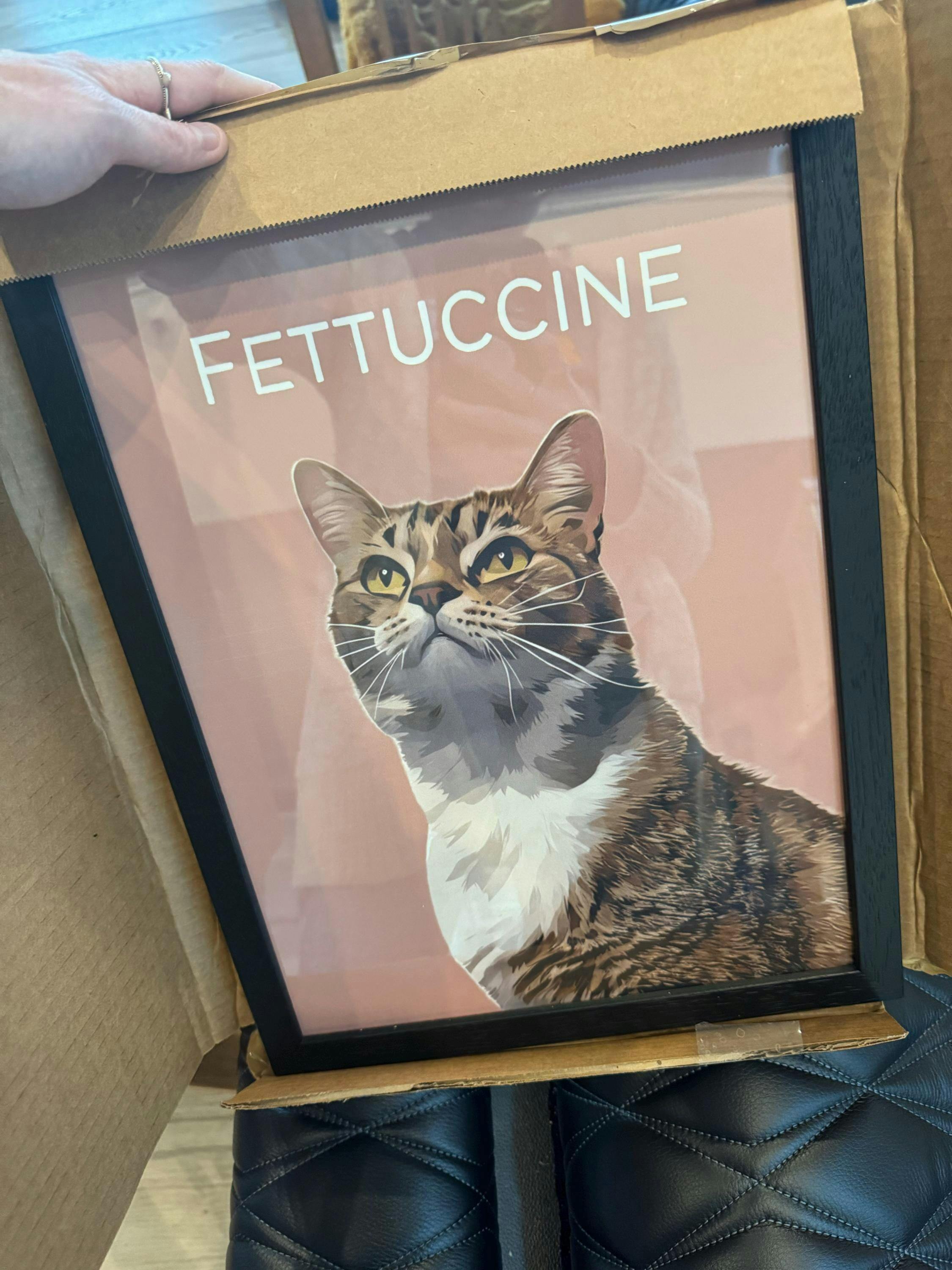I couldn’t be happier with this portrait of my cat, Fettuccine! The seller was amazing to work with—when I asked for a couple of changes, they made sure everything was adjusted perfectly. The artwork looks exactly like my cat, and I know my husband is going to absolutely love it. It arrived safely with great packaging, so everything was in perfect condition. This isn’t my first order from this shop, and it definitely won’t be my last. Their pet portraits are truly special, and I’ll be coming back again for more. Highly recommend!