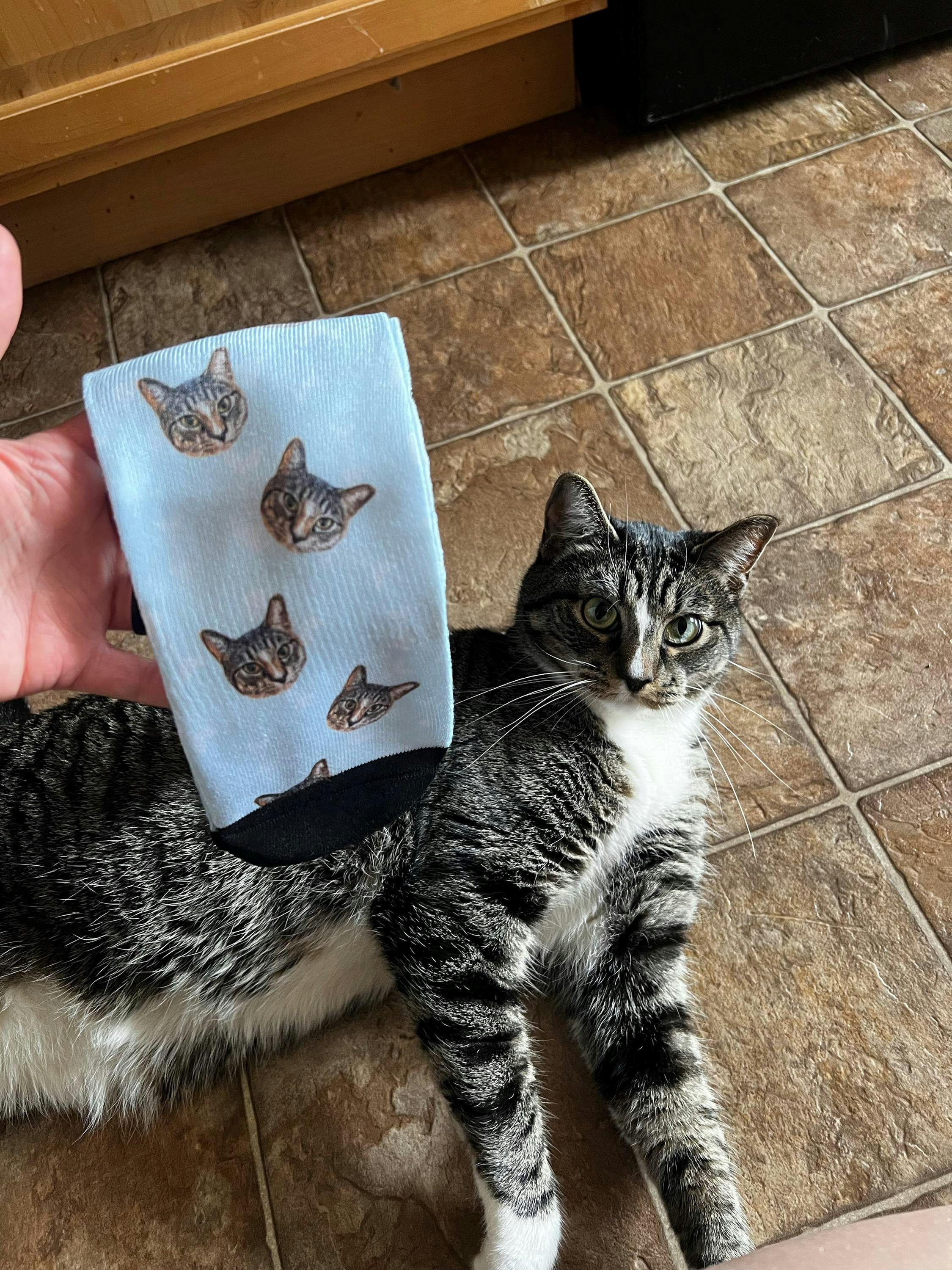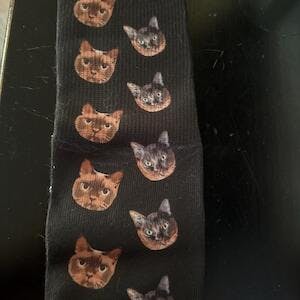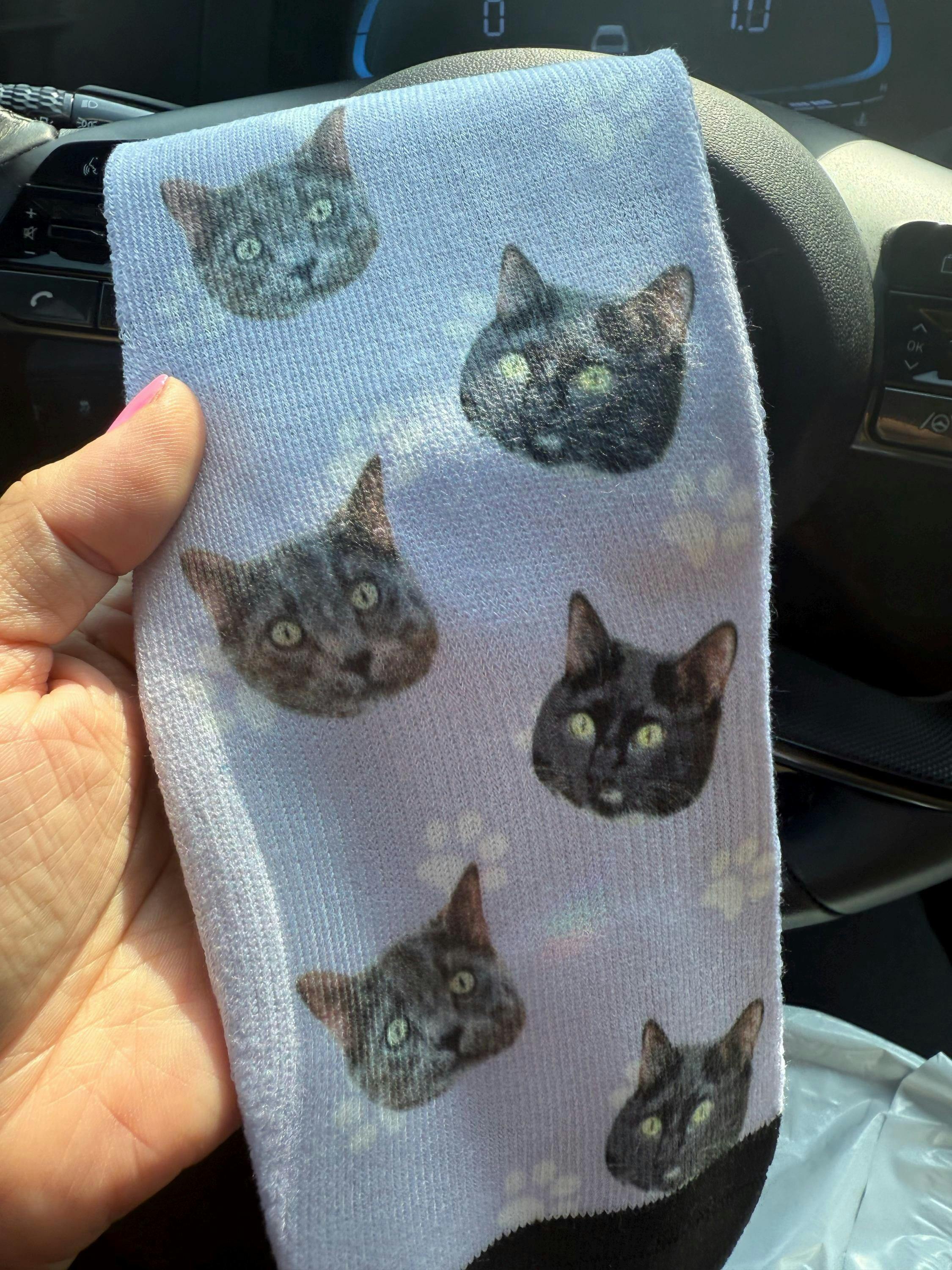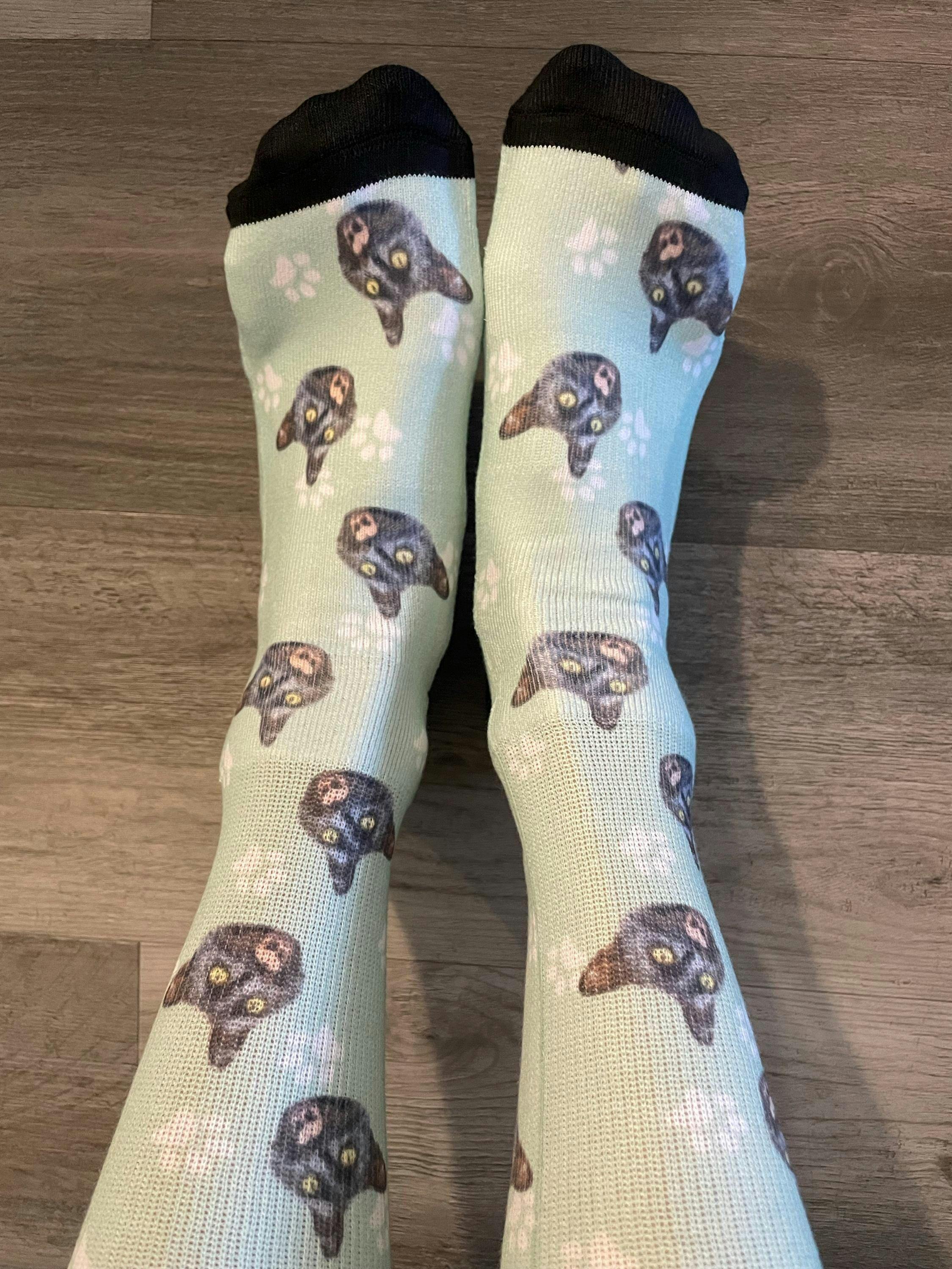 Celebrate the bond between you and your pet with these one-of-a-kind, modern pet socks that not only pays homage to your pet but seamlessly match any outfit. These pet socks featuring your best friend will effortlessly match any aesthetic and most definitely be a conversation starter. These tastefully designed cat socks can be purchased for you or an ideal gift for the dog or cat lovers, pet memorial gifts, or gifts for dog owners, and more! Your pet is designed on all-over print, crew length sock to keep your feet and calfs warm during those chilly days. The fleece lining inside the bottom of the sock feels like you're walking on a cloud.
