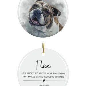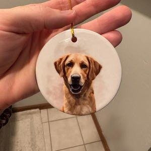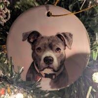 Celebrate the holidays and your pet with this unique, modern custom ornament. Our solidly constructed ornaments are made from high-quality porcelain to ensure use year after year. Our one-of-a-kind design is digitally crafted, printed on the ornament based on your pet's photo submission, and includes your PET NAME. Perfect for gifting to friends and family as well!